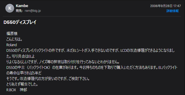 内容は、Roland(楽器)のディスプレイ交換の話(笑)。それ以前のメールは引き継げず、古いMac本体と一緒に倉庫で眠ってるってわけだね^^。